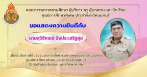 คณะกรรมการสถานศึกษา ผู้บริหาร คณะครู บุคลากรทางการศึกษา ผู้ปกครอง และนักเรียน ศูนย์การศึกษาพิเศษ ประจำจังหวัดนนทบุรี ขอแสดงความยินดีและยินดีต้อนรับ นายสุวิจักขณ์ บึงประเสริฐสุข ในโอกาสได้รับการบรรจุและแต่งตั้งให้ดำรงตำแหน่งรองผู้อำนวยการศูนย์การศึกษาพิเศษ ประจำจังหวัดนนทบุรี สังกัดสำนักบริหารงานการศึกษาพิเศษ