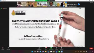 นางวิชุดา โชคภูเขียว ผู้อำนวยการศูนย์การศึกษาพิเศษ ประจำจังหวัดนนทบุรี พร้อมด้วยนางสาวพรรณธิภา จันประตูมอญ รองผู้อำนวยการฯ และคณะครูกลุ่มบริหารวิชาการ เข้าร่วมประชุมออนไลน์ผ่านโปรแกรม Zoom Meeting เรื่องแนวทางการเปิดภาคเรียน ภาคเรียนที่ 2/2564 ภายใต้สถานการณ์แพร่ระบาดของโรคติดเชื้อไวรัสโคโรนา (Covid-19) สำนักงานคณะกรรมการการศึกษาขั้นพื้นฐาน กระทรวงศึกษาธิการ โดยมีดร.คุณหญิงกัลยา โสภณพนิช รัฐมนตรีช่วยว่าการกระทรวงศึกษาธิการ เป็นประธานในการประชุมดังกล่าว