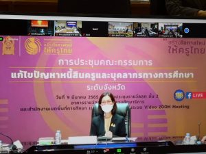 ดร.วิชุดา โชคภูเขียว ผู้อำนวยการศูนย์การศึกษาพิเศษ ประจำจังหวัดนนทบุรี มอบหมายให้นางเพ็ญพักตร์ แก้วจรูญ หัวหน้ากลุ่มบริหารแผนงานและงบประมาณ เข้าร่วมประชุมคณะกรรมการแก้ไขปัญหาหนี้สินข้าราชการครู และบุคลากรทางการศึกษาระดับจังหวัดและเขตพื้นที่การศึกษา ผ่านระบบออนไลน์ ( ZOOM Video Conference Meeting ) โดยมีนางสาวตรีนุช เทียนทอง รัฐมนตรีว่าการกระทรวงศึกษาธิการ เป็นประธานในการประชุมดังกล่าว ณ ห้องประชุมราชพฤกษ์ ชั้น 4 ศาลากลางจังหวัดนนทบุรี